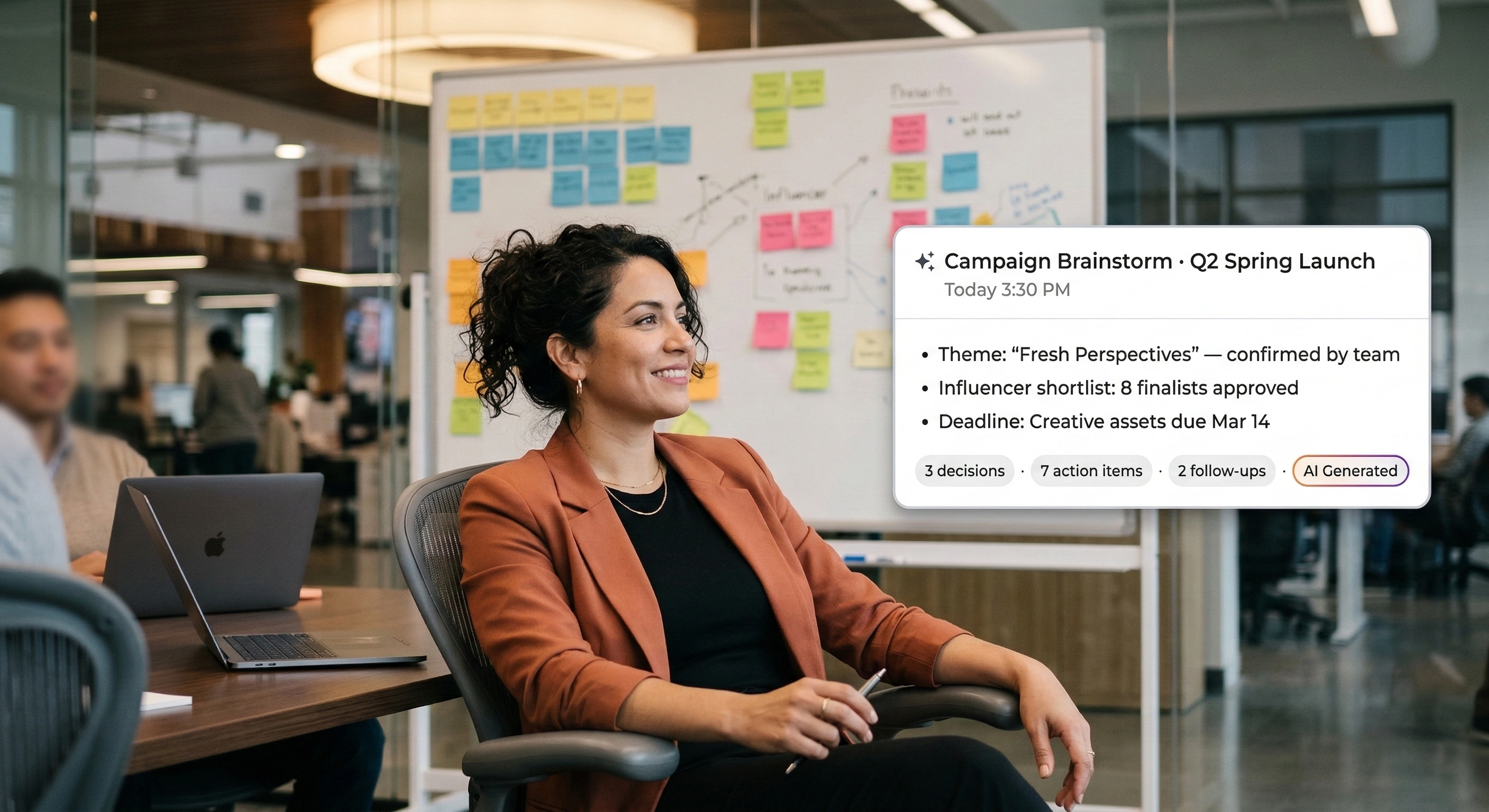 - AI-generated summaries capture approvals, decisions, and next steps automatically.