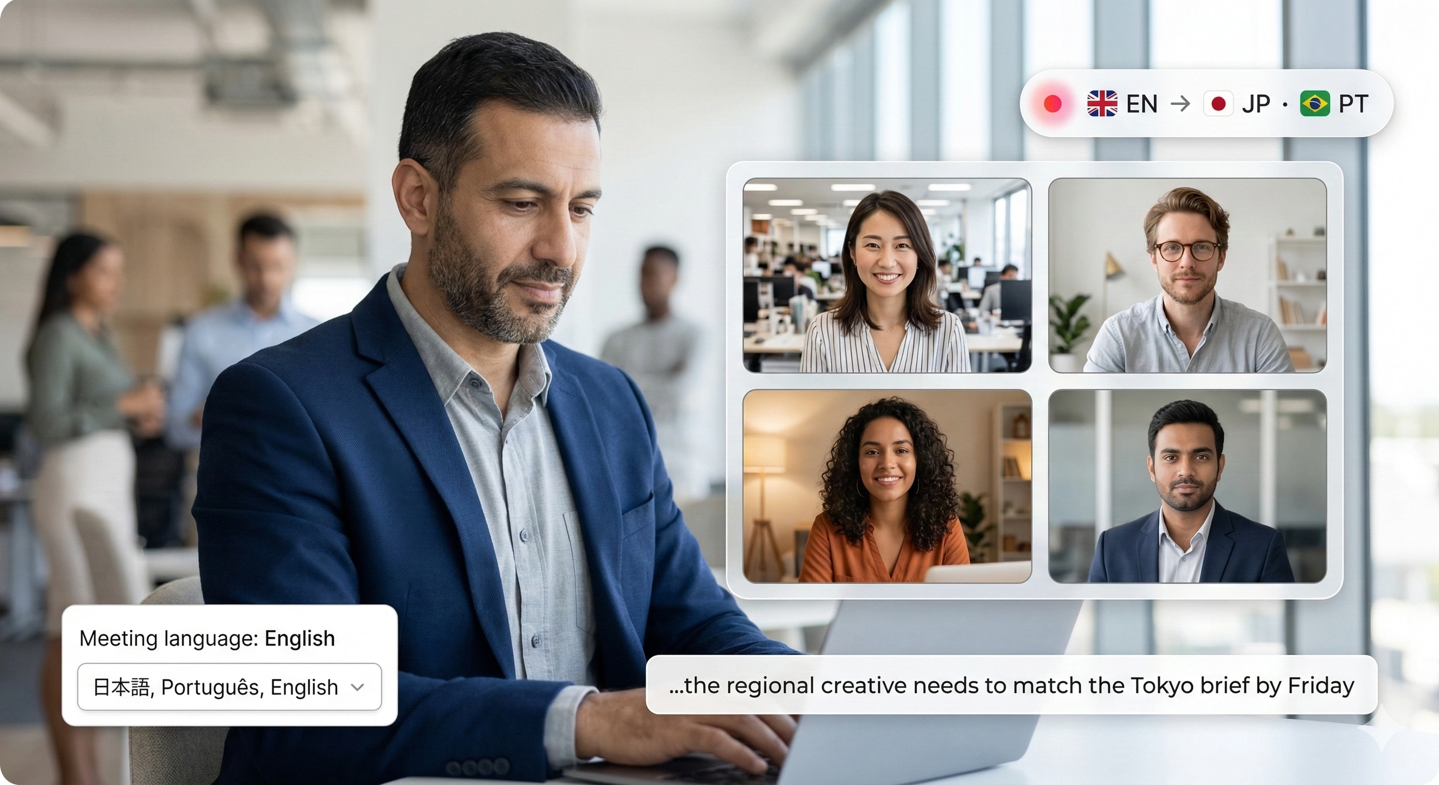 Marketing teams working across regions and languages can coordinate campaigns, review creative, and align messaging — without interpreters or translation delays.